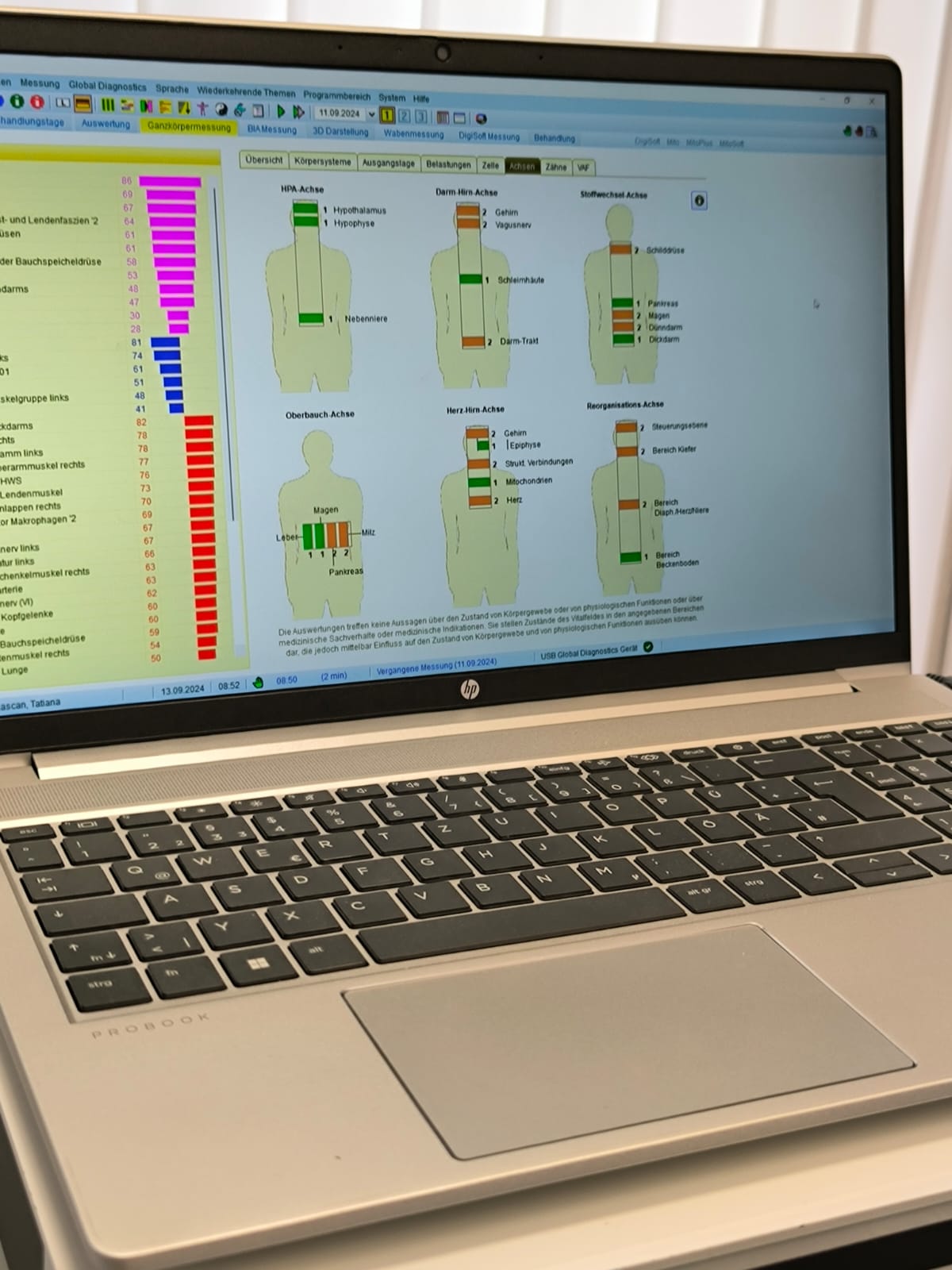Jede Messung wird einem von 540 verschiedenen Messobjekten des Körpers zugeordnet. Die Ergebnisse, die sich auf Systeme, Funktionen, Organe usw. beziehen, werden sofort bildlich auf dem Computer dargestellt. Aus diesen Daten gewinne ich wertvolle diagnostische Hinweise. Im Idealfall können energetische Beeinträchtigungen bereits erkannt werden, bevor körperliche bzw. organische Störungen entstehen. So unterstützt mich Global Diagnostics bei der Diagnose, Vorbeugung und Therapie.