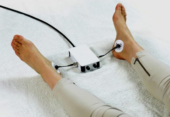 Zur Messung legt sich der Patient möglichst bequem und entspannt auf eine Behandlungsliege. In einem angenehm warmen Behandlungszimmer werden die Füße freigemacht. In der Nähe der Innenknöchel setze ich jeweils eine Klebeelektrode an jedem Fuß auf. Diese sind über kurze Kabel mit dem Gerät verbunden. Anschließend starte ich das computergesteuerte Messprogramm.